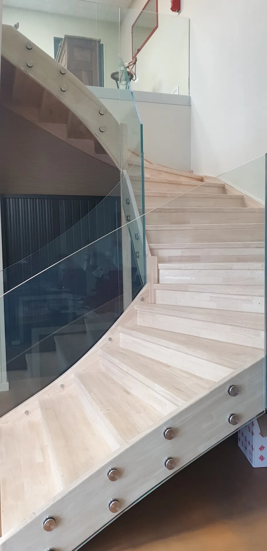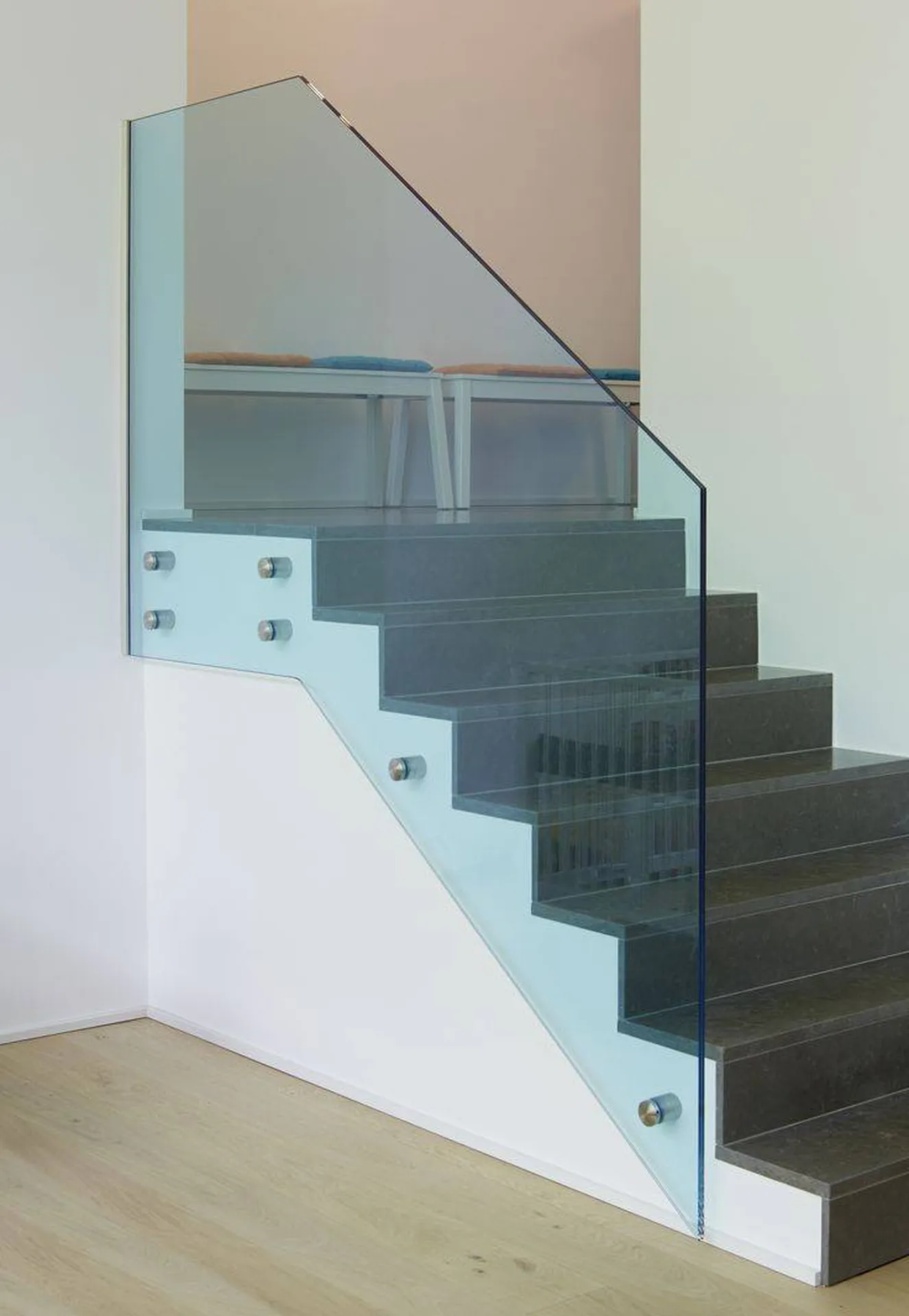 Le garde corps en verre feuilleté est tenu par des entretoises fixés dans les nez de marche.