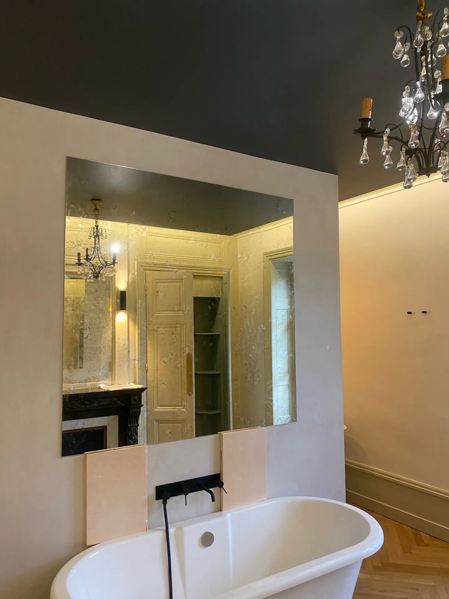 après une analyse, du chantier , une prise de côte précise, les poseurs d'AVM ont coupé les miroirs vieillis dans la bonne taille, et les a posé avec délicatesse dans un château à Villiers Morgon dans le beaujolais.